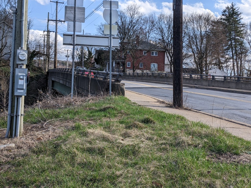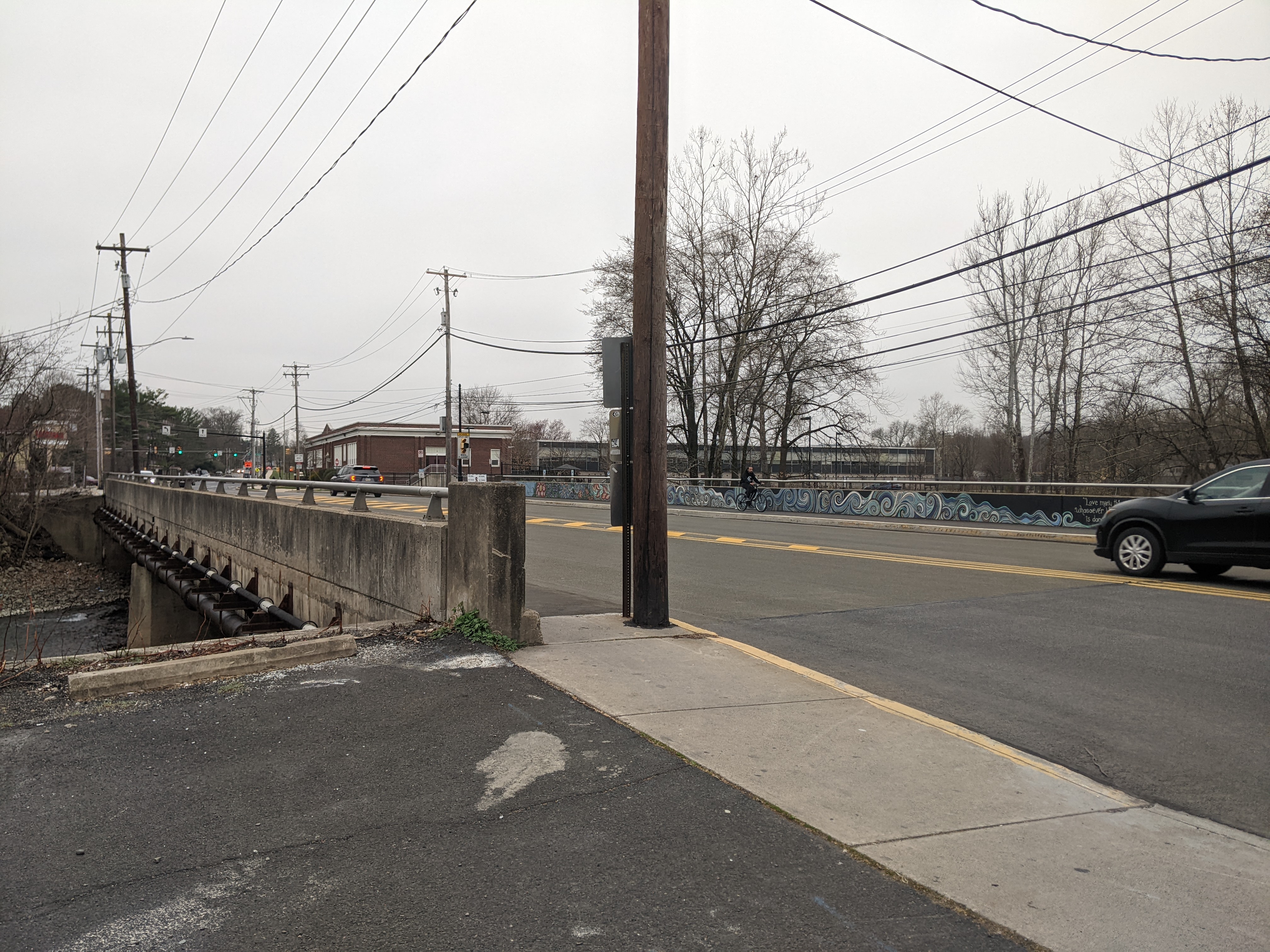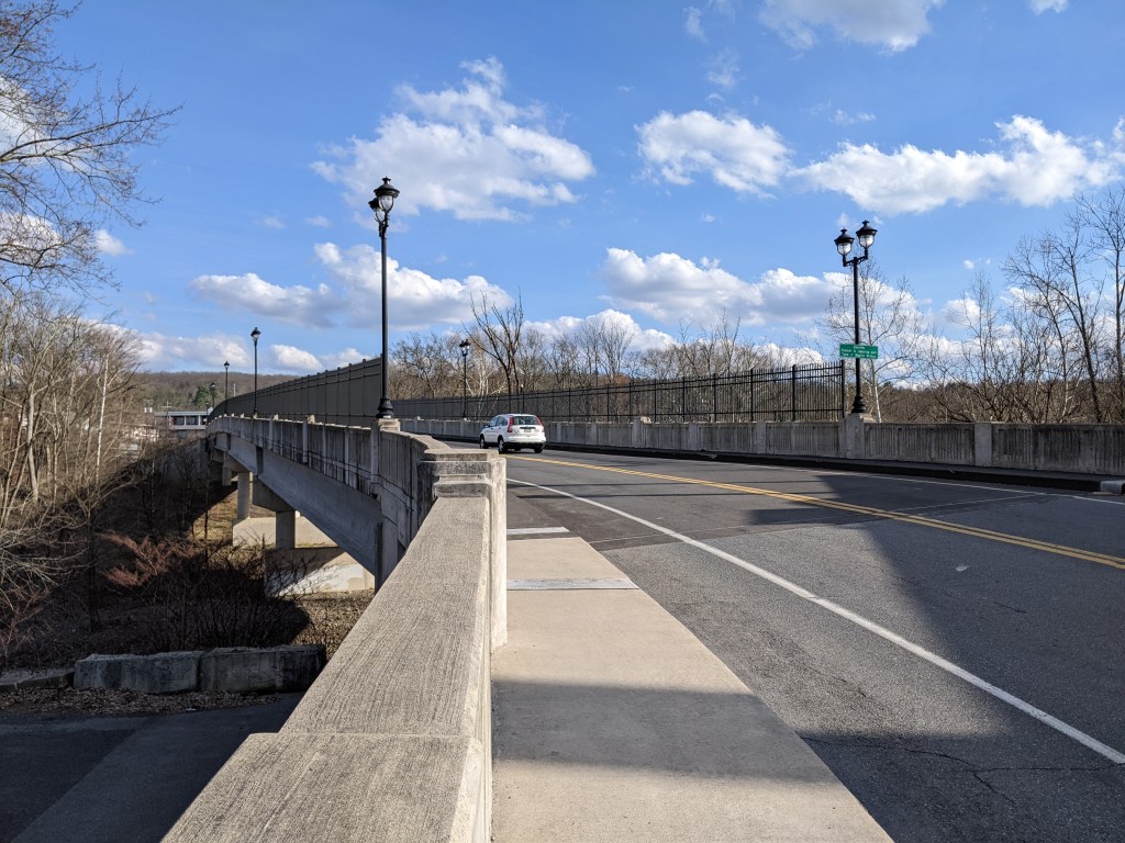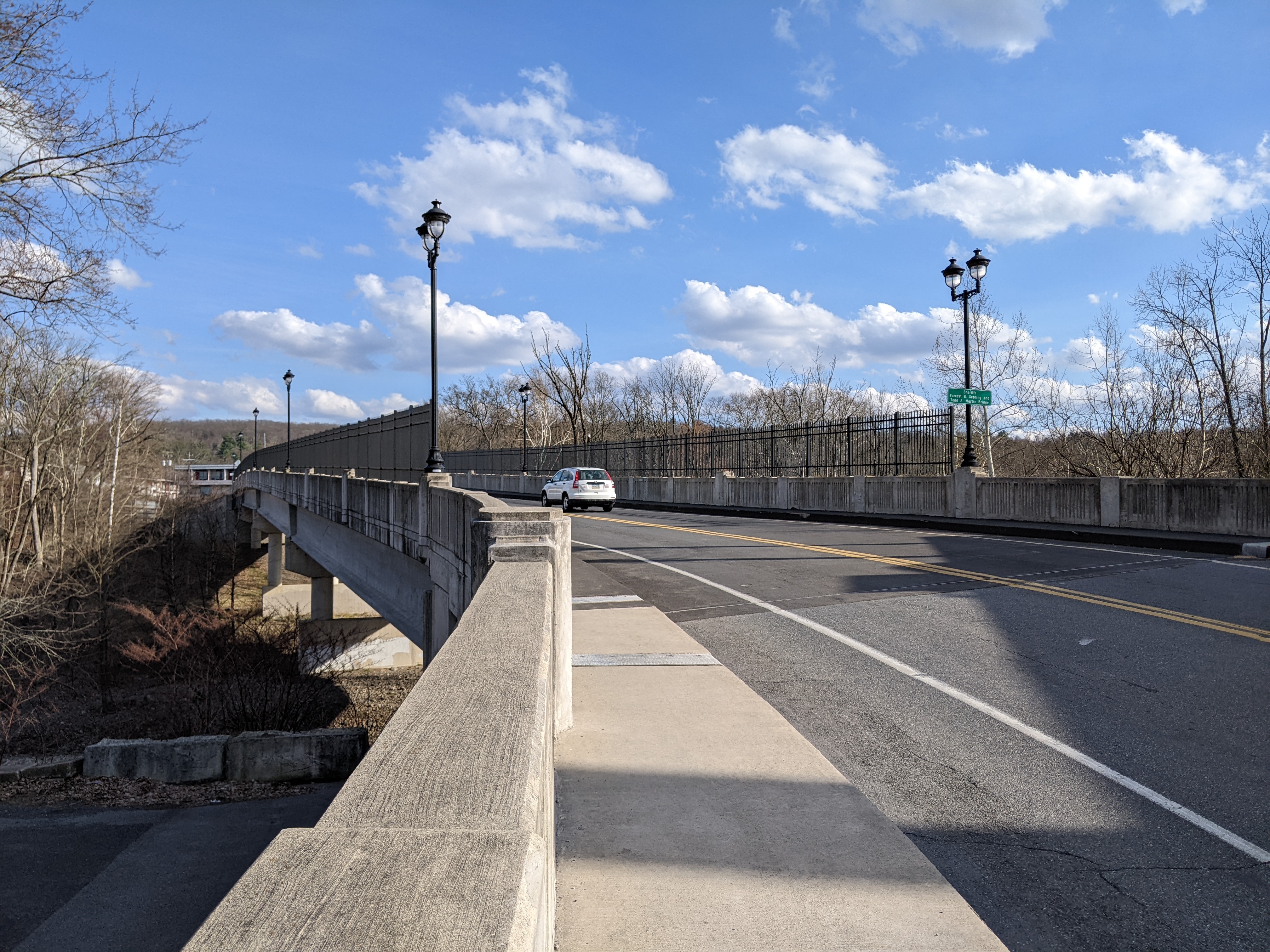 Down the hill from this bridge is the Interborough Bridge. This bridge connecting East Stroudsburg and Stroudsburg used to be a through-truss, possibly also a Warren pony truss bridge. When it was destroyed by a flood in 1955, the replacement did not pay homage to the past. The plain replacement bridge is very utilitarian and not much else. My foot had reached the end of its stamina before I was able to walk across it on this trip – which was actually a relief. I walked across it at least once when I was a kid. I remember it feeling unpleasant. There are sidewalks, but the proportion of vehicles lanes is quite large, cars move fast, and either end features auto-oriented uses. The one nice feature of the bridge are the views of Brodheads Creek, but there are plenty other more pleasant vantage points to view the creek.