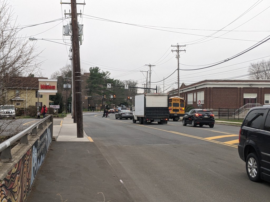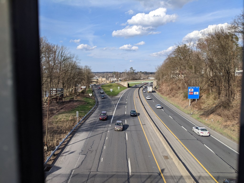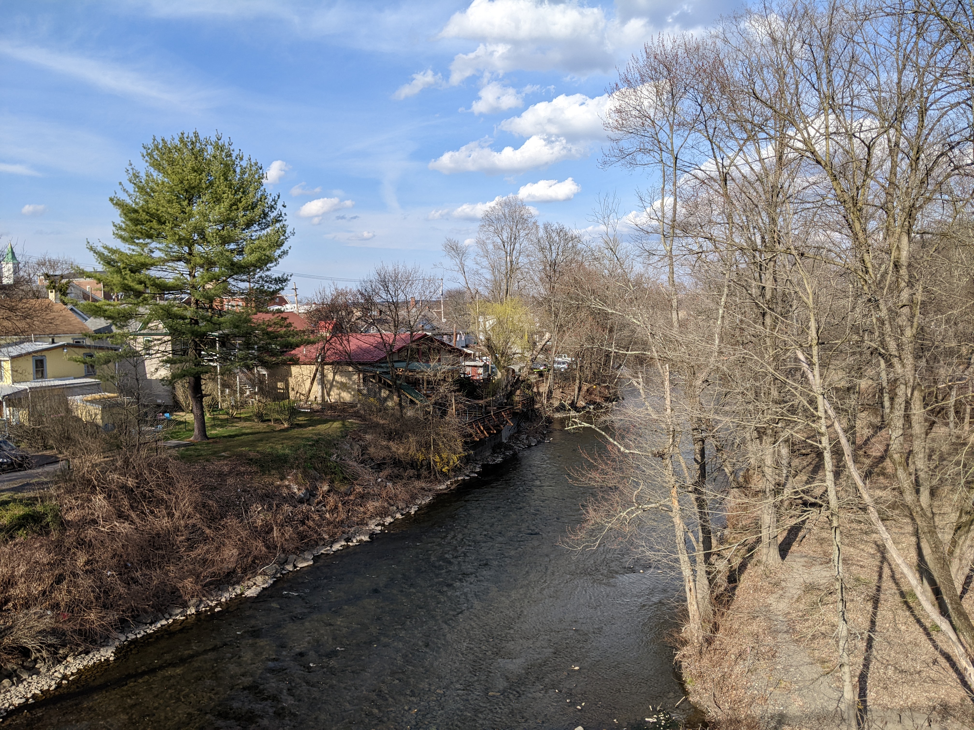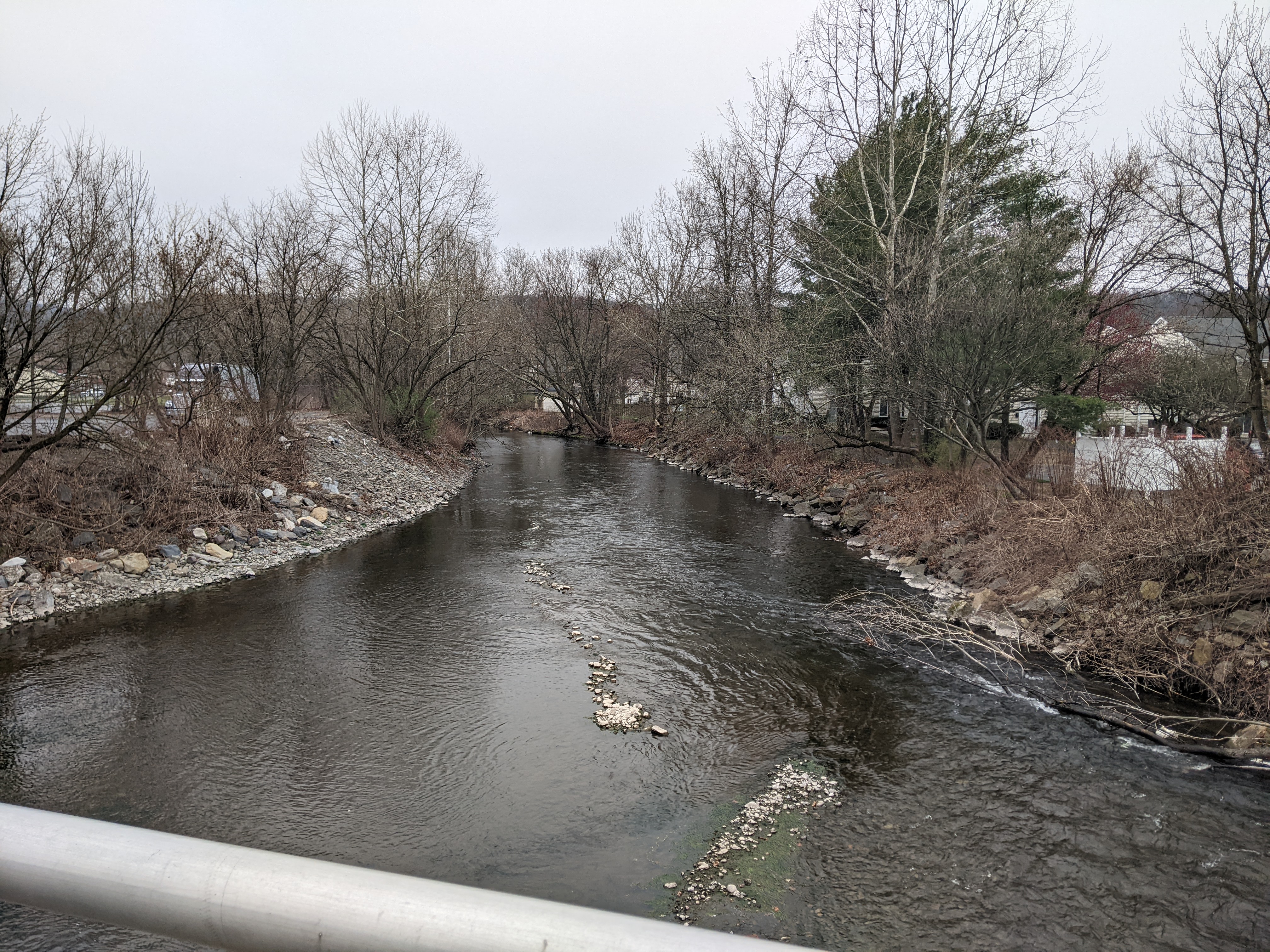 Down the hill from this bridge is the Interborough Bridge. This bridge connecting East Stroudsburg and Stroudsburg used to be a through-truss, possibly also a Warren pony truss bridge. When it was destroyed by a flood in 1955, the replacement did not pay homage to the past. The plain replacement bridge is very utilitarian and not much else. My foot had reached the end of its stamina before I was able to walk across it on this trip – which was actually a relief. I walked across it at least once when I was a kid. I remember it feeling unpleasant. There are sidewalks, but the proportion of vehicles lanes is quite large, cars move fast, and either end features auto-oriented uses. The one nice feature of the bridge are the views of Brodheads Creek, but there are plenty other more pleasant vantage points to view the creek.