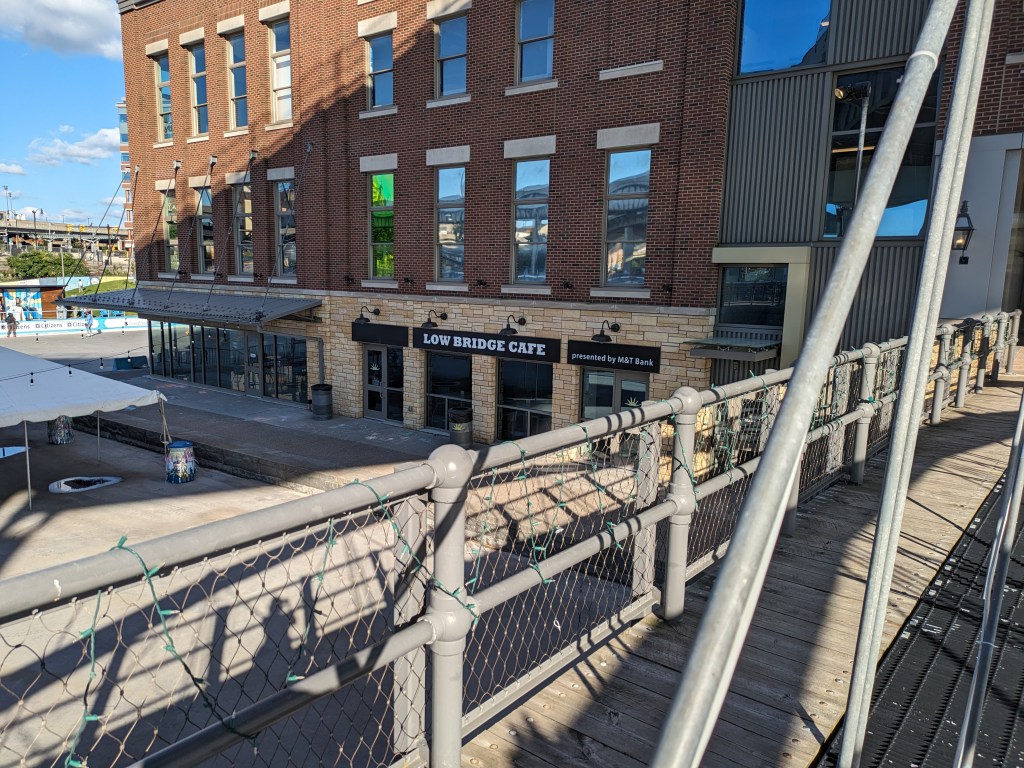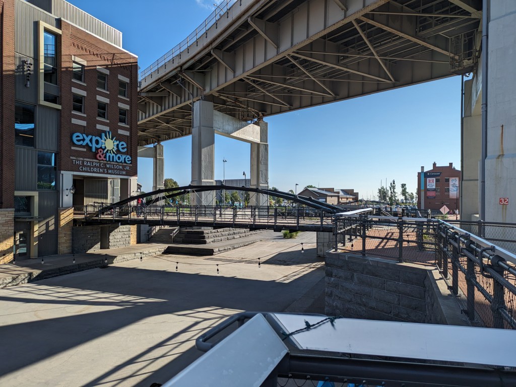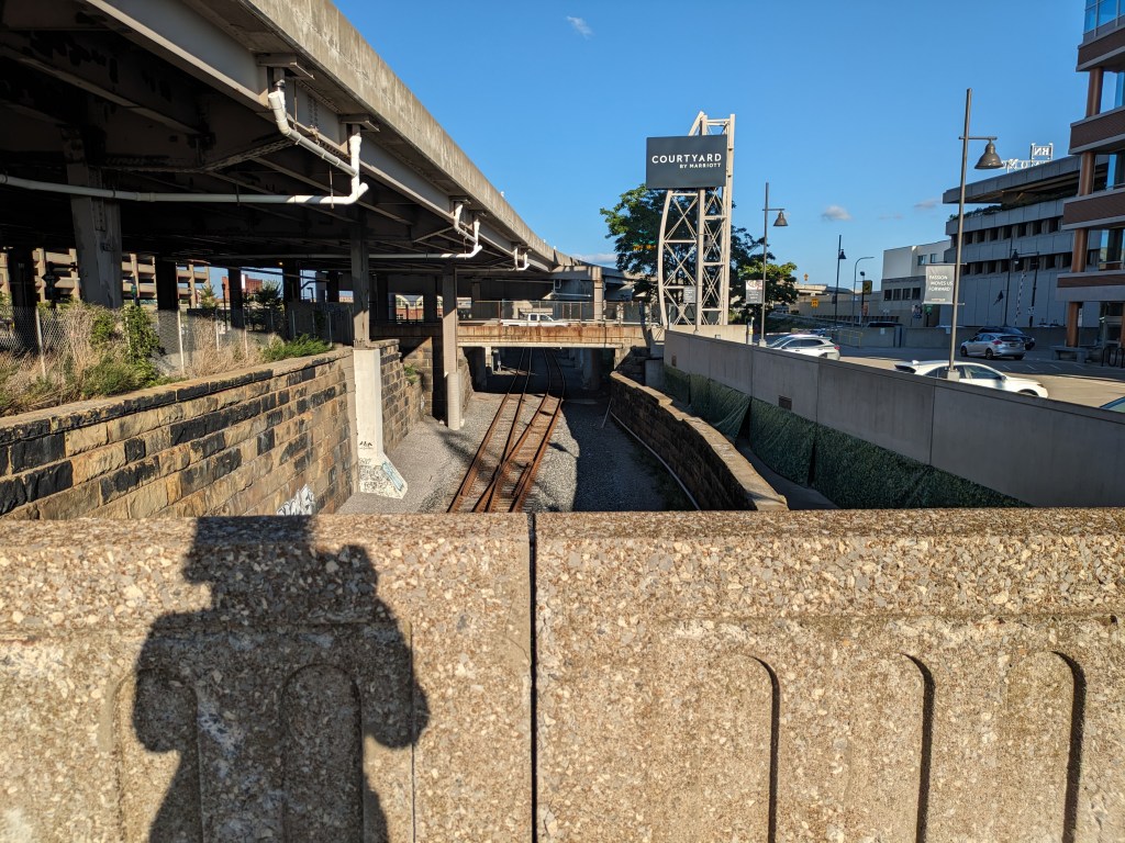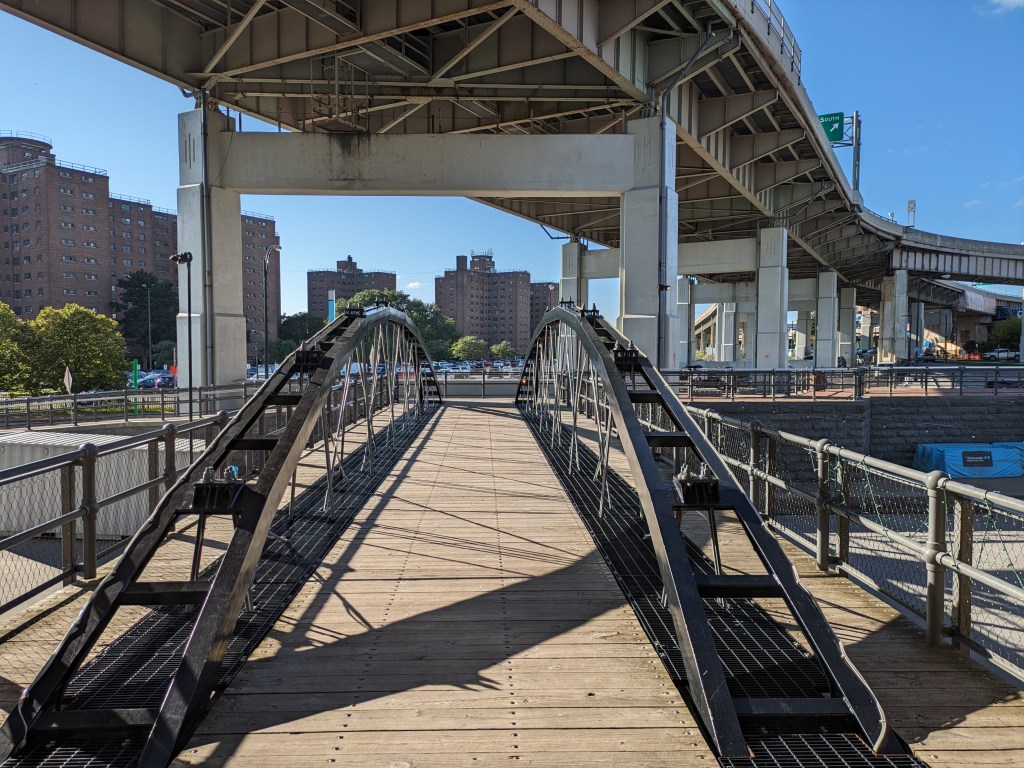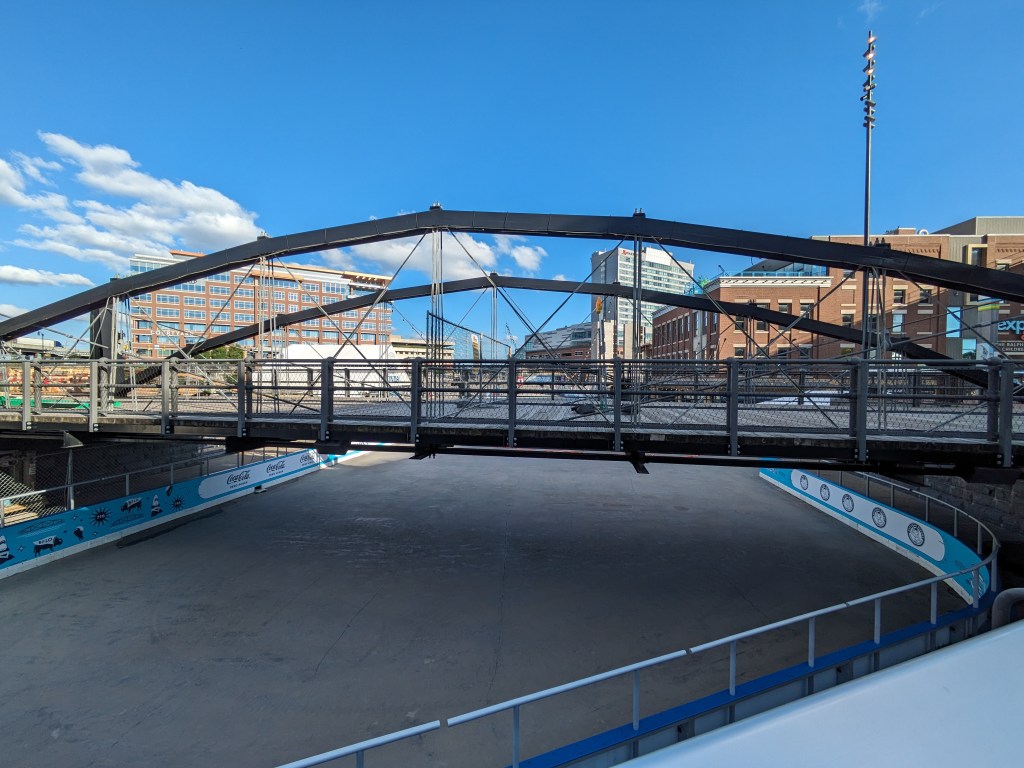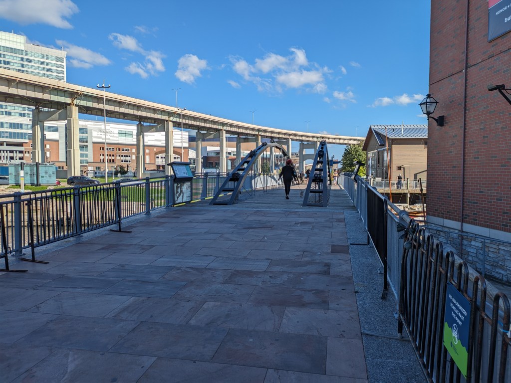 The open, through-arch Frederick Douglass Memorial Bridge was one of our expected encounters. I probably would have been ecstatic about the unexpected benches in the lookouts between the arches under previous circumstances. After all, it isn’t every day that you find a bench on a bridge. However, in the past, I probably would have just said “that’s cool,” photographed them, and moved on. Instead, I took full advantage of these seats for one of my rest and rehydration breaks. This slow down is the reason I spotted the Yard Park Bridge, a bridge I definitely needed to add to my collection.