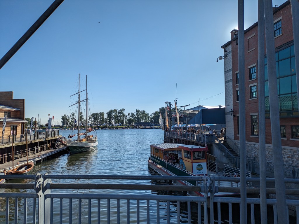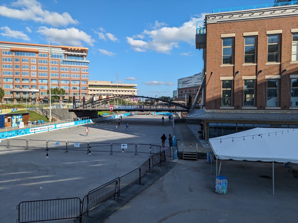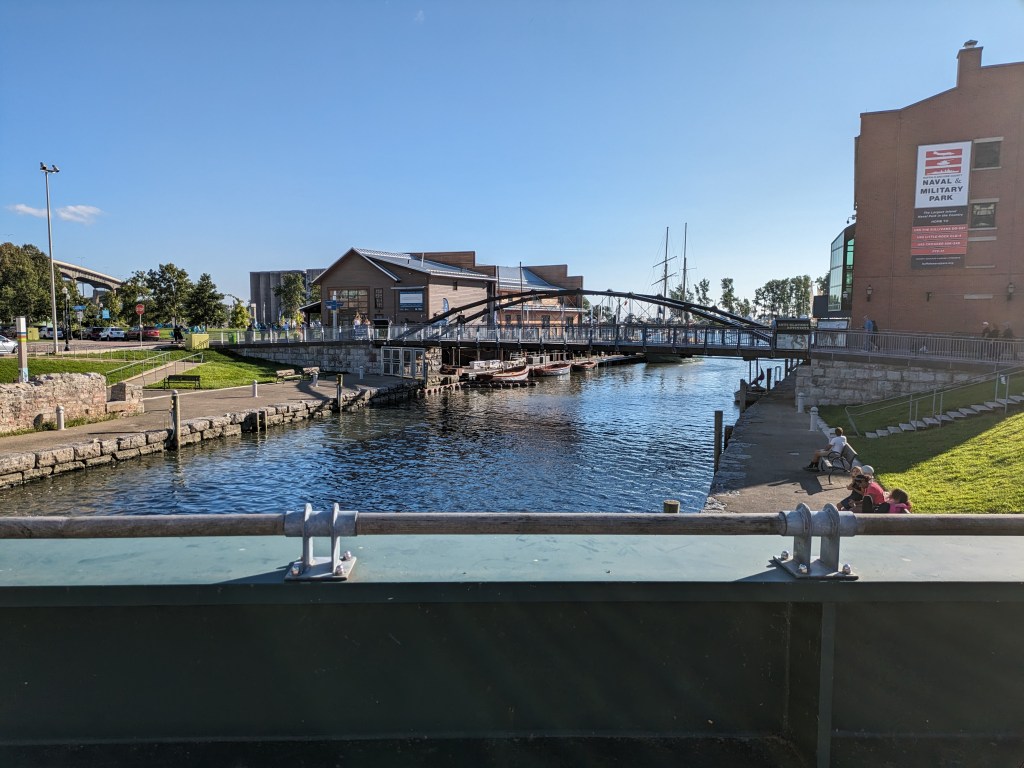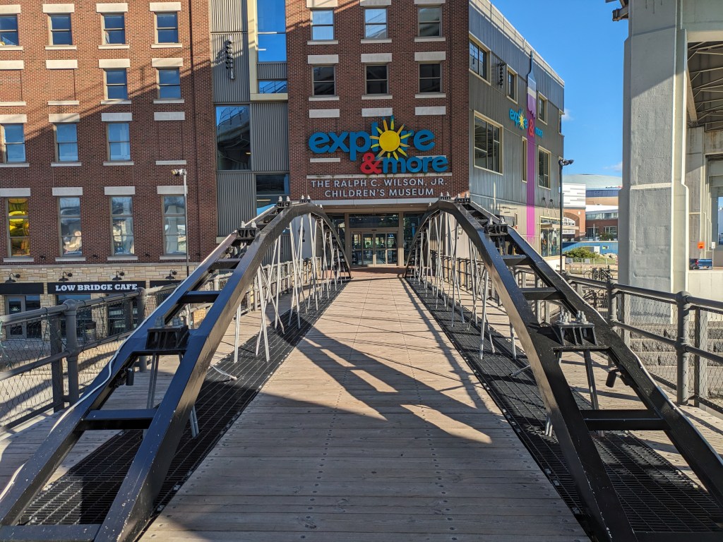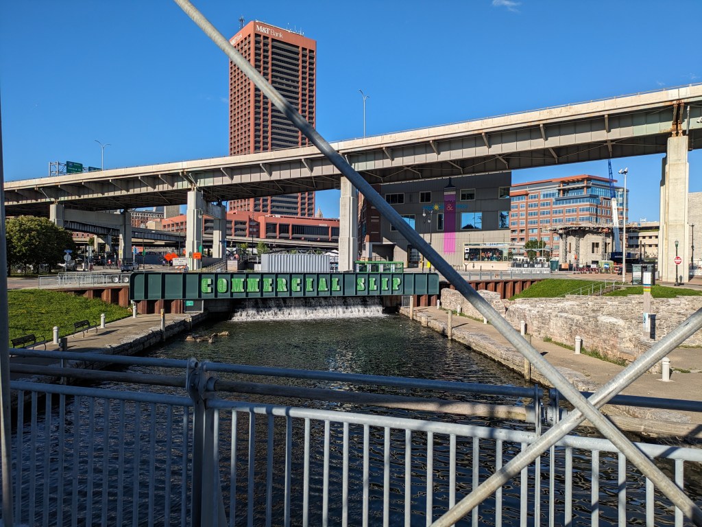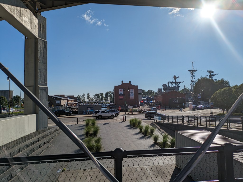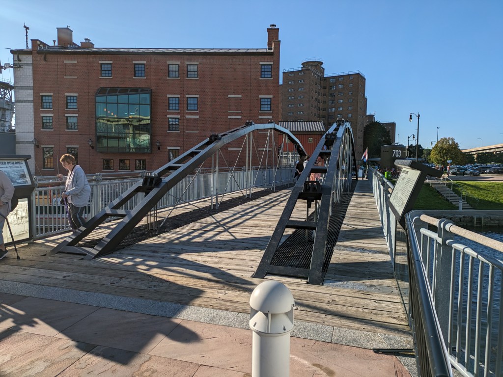The open, through-arch Frederick Douglass Memorial Bridge was one of our expected encounters. I probably would have been ecstatic about the unexpected benches in the lookouts between the arches under previous circumstances. After all, it isn’t every day that you find a bench on a bridge. However, in the past, I probably would have just said “that’s cool,” photographed them, and moved on. Instead, I took full advantage of these seats for one of my rest and rehydration breaks. This slow down is the reason I spotted the Yard Park Bridge, a bridge I definitely needed to add to my collection.